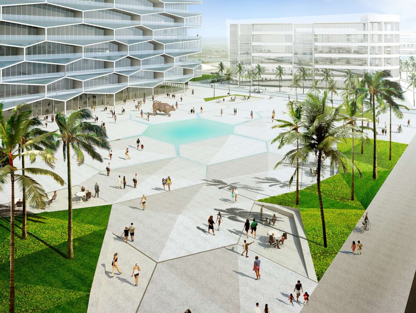 BIG designs the new Albany Marina Residences and its adjacent public plaza in The Bahamas – a 175,000sf (ca. 16,000sqm) Honeycomb building with a private pool on each balcony overlooking the marina.