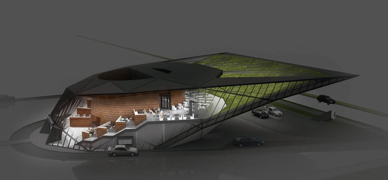 The vegetation layer, which covers the cantilevered giant canopy of the fuel station adds natural environment and acts as a "ecological shield" for the terrace.