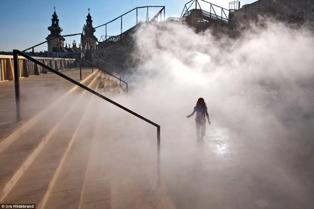 A breathtaking art installation gives people the chance to walk in the clouds by creating a thick blanket of fog on the roof of a city car park. Cloud Parking, which was created by Japanese artist Fujiko Nakaya in Linz, Austria, back in 2011 uses a specially designed fog system to artificially create clouds which completely envelop visitors.