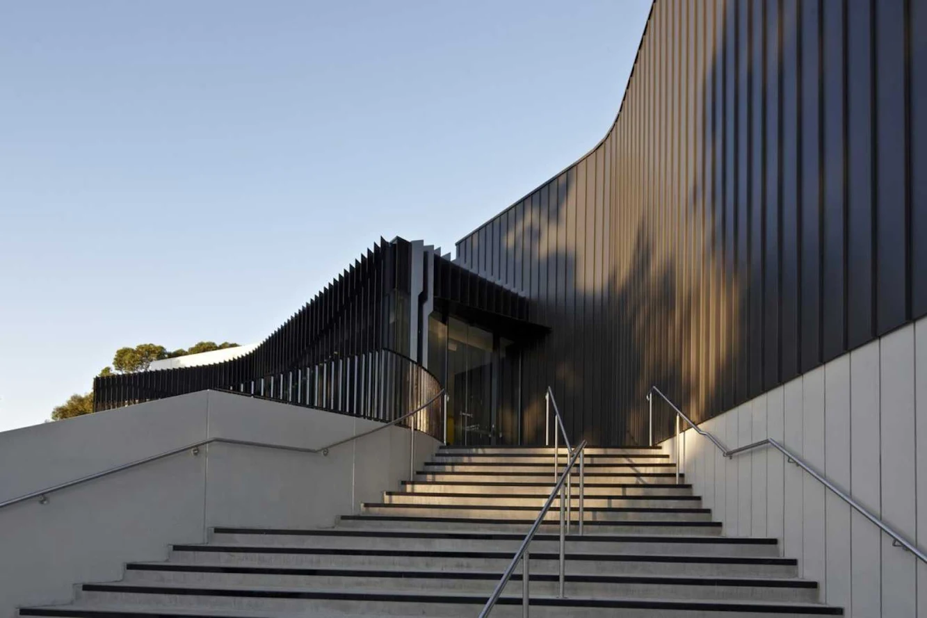 These ramps and courtyard seating are insitu-formed concrete in a black pigment colour, setting up a strong contrasting language between the white precast panelling, the black Micaceous Iron Oxide louvers to the foyer and the exposed aggregate finish to the courtyard.