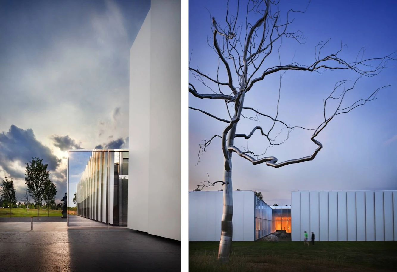 Nearly tangible, the spatial insertions, yielding glimpses of water, mossy rock, grasses, and outdoor sculpture, become integral to the gallery experience. Back outside again, the building skin—a rain screen of pale, matte anodized-aluminum panels—carries on the discourse with the landscape.