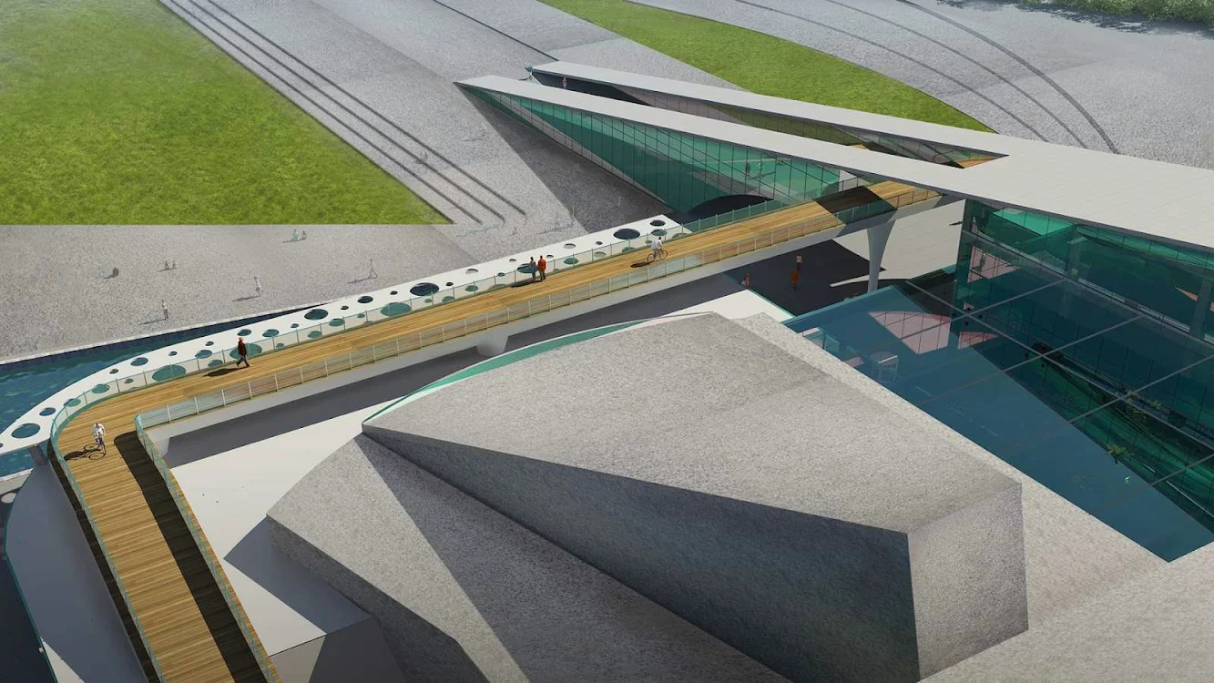 A footbridge installed on top of the exhibition hall allows visitors to reimagine contemporary building structure. This footbridge starts from east and continues to the west across the building and covered with the wooden surface. With the help of the footbridge pedestrians will be able to enjoy the view of the landscape while walking, to examine building structures and also to have a visual access to the exhibition space via glazed roofing panels below the bridge structure.