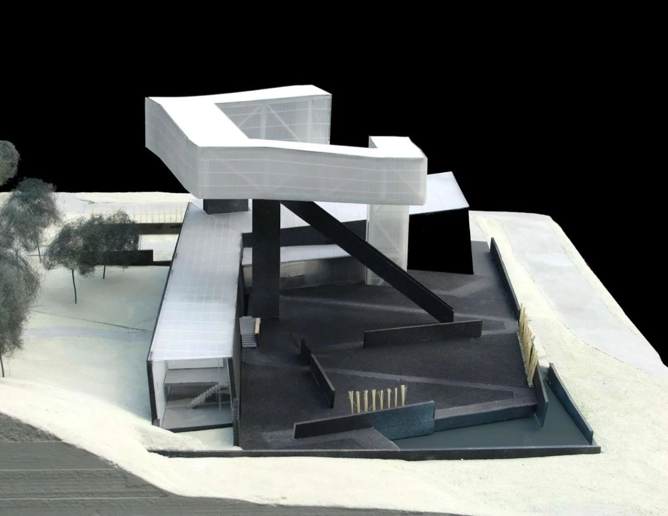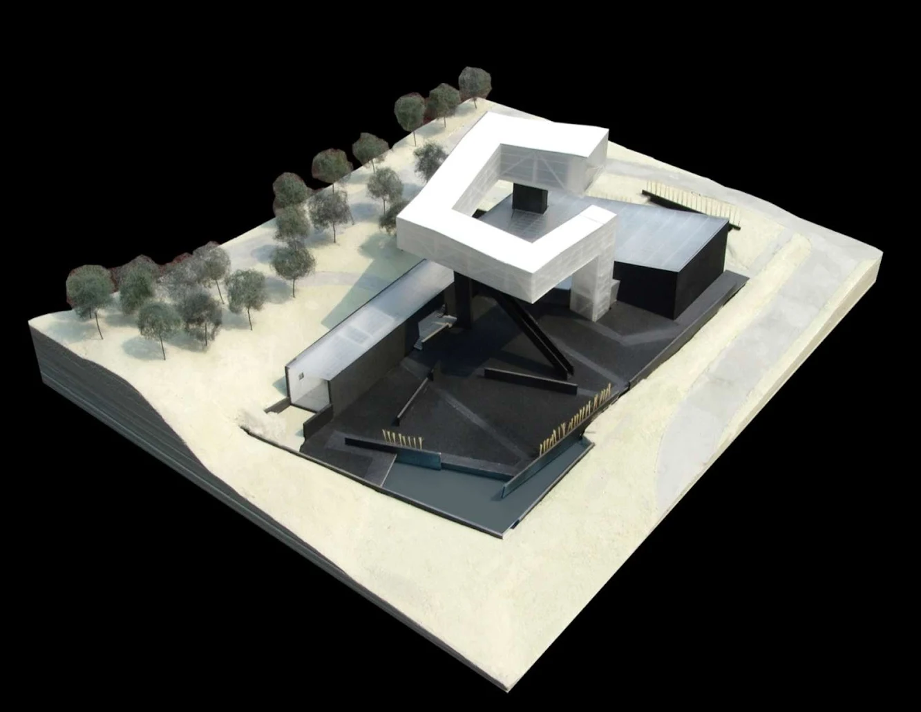The museum is formed by a "field" of parallel perspective spaces and garden walls in black bamboo-formed concrete over which a light "figure" hovers. the straight passages on the ground level gradually turn into the winding passage of the figure above.