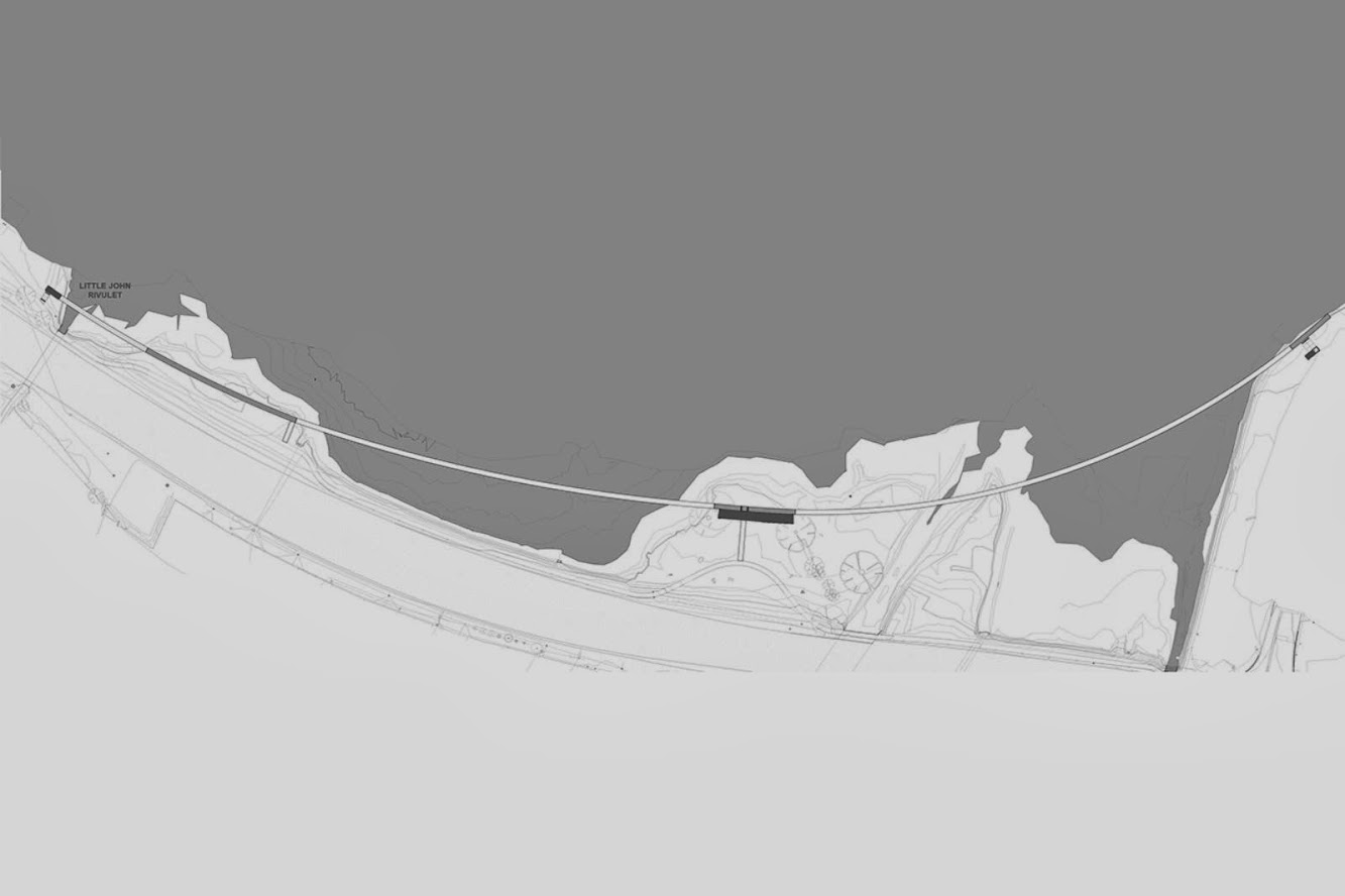 Sitting just above the high tide level, the boardwalk cuts a consistent datum line through the site. Oblique views reveal the 44 rhythmically composed colours and a striking moiré effect rolling across the structure, matched to the walking or driving speed of whoever views it. the structure is wired for sound.
