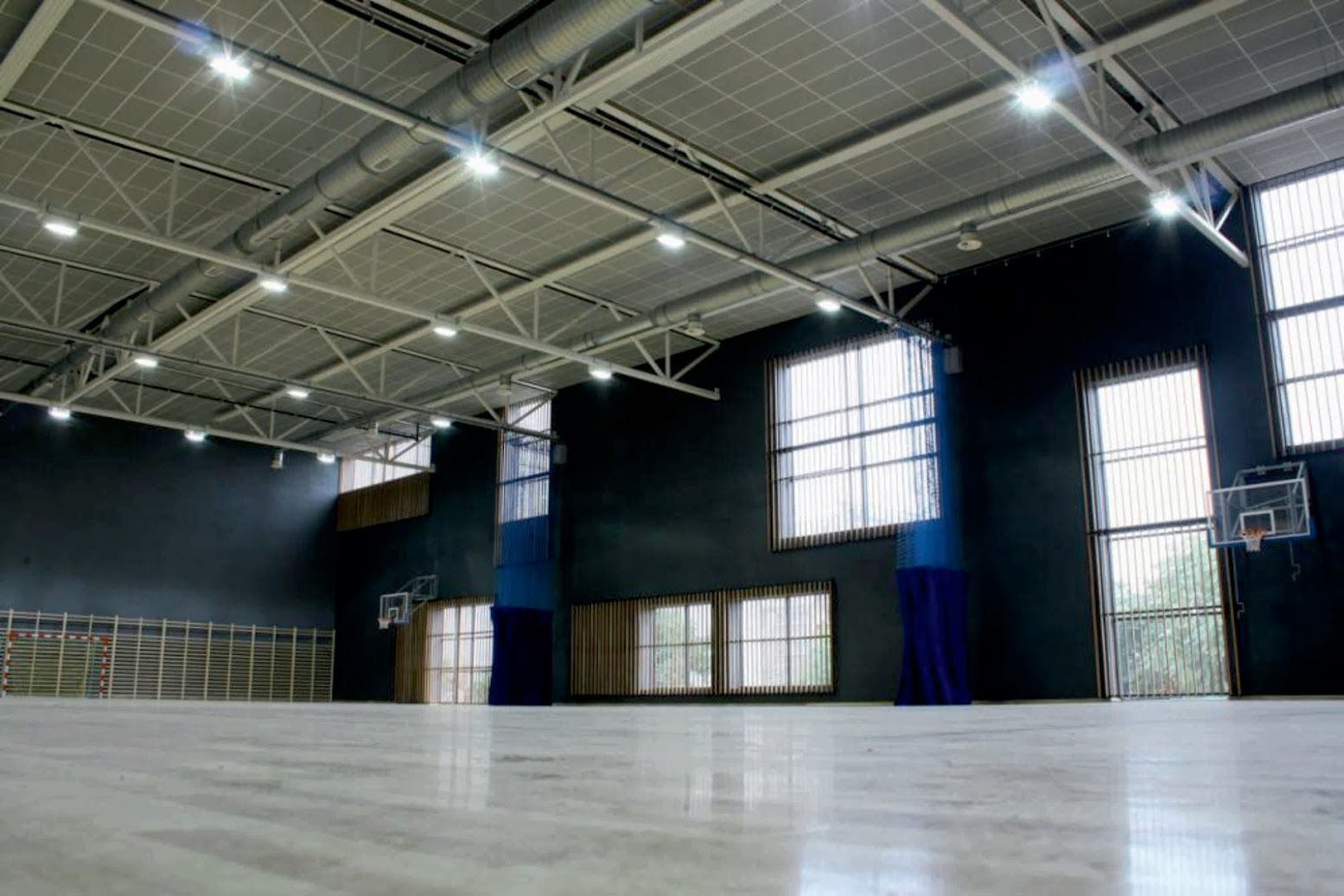 Except from large, multifunctional sports hall, whole complex comprise climbing wall, gym, and outdoor playing fields with running track.